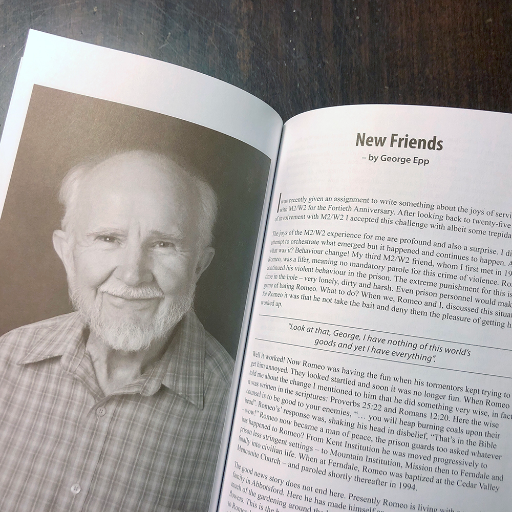 George’s own contribution, “New Friends,” looks at the joys and surprises of volunteering with M2W2. The essay focuses on George’s relationship with Romeo and his journey from solitary confinement at Kent to parole. George recounts shared moments and conversations about scripture.